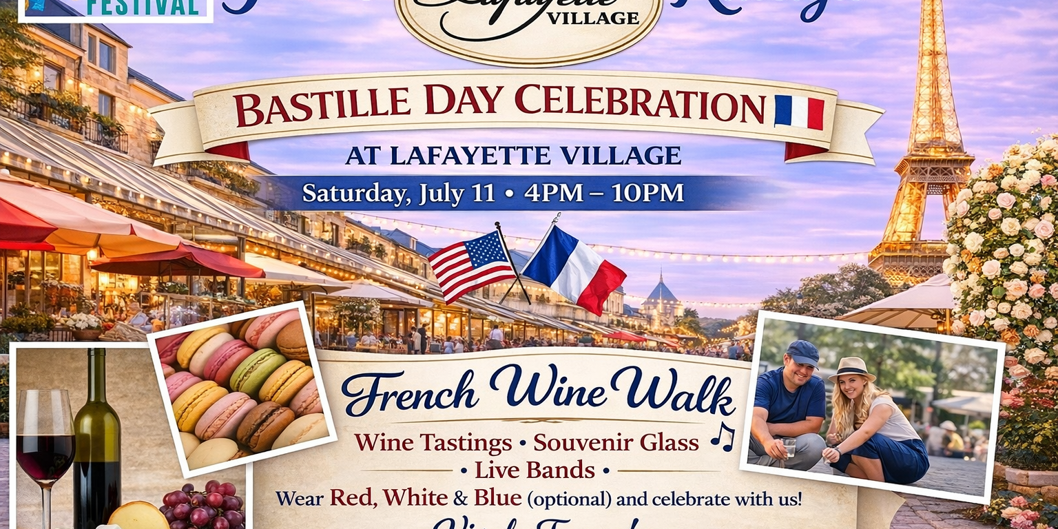 Bastille Day Celebration at Lafayette Village -Wine Tasting Walk • Live Bands • French Market • An Evening in the Spirit of France.